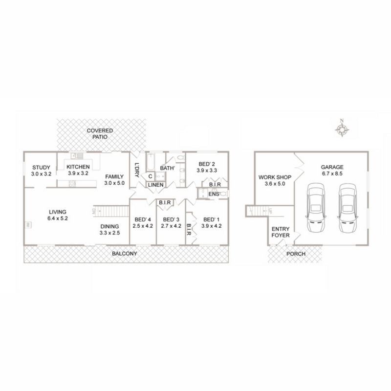 • Garage can take 1 large car plus 2 small cars