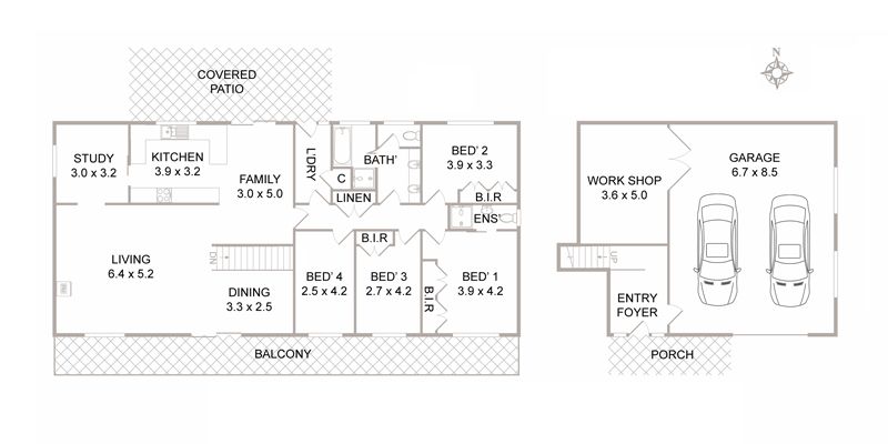 • Garage can take 1 large car plus 2 small cars