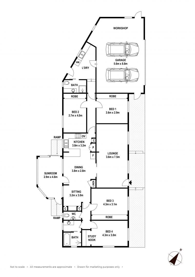 - High ceilings and tiled throughout, except for sunroom
